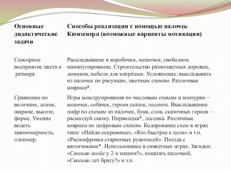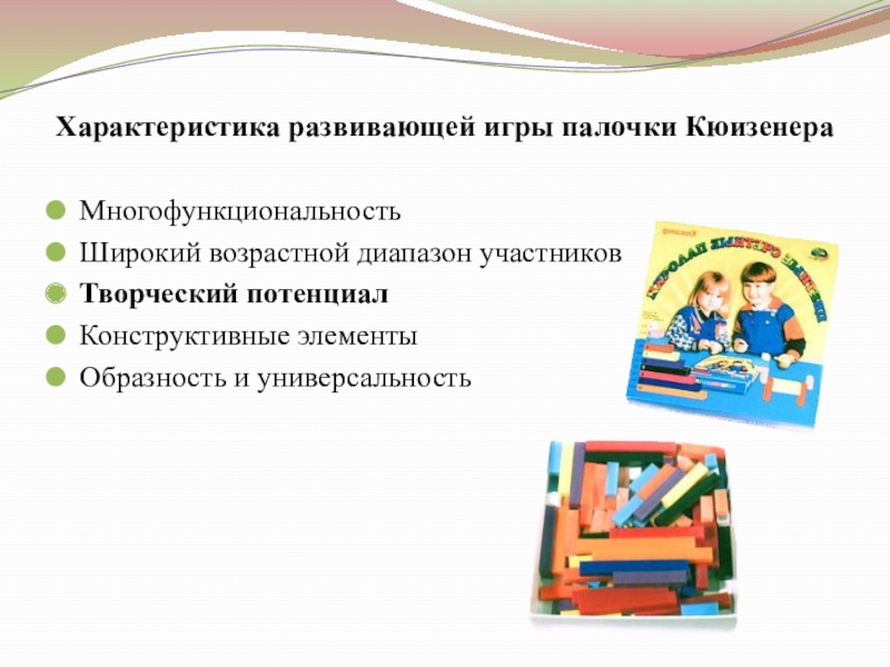 Слайд 7Характеристика развивающей игры палочки Кюизинер
