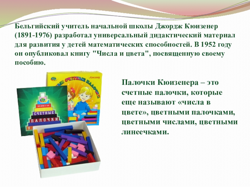 Слайд 2Бельгийский учитель начальной школы Джордж Кюизенер (1891-1976) разработал универсальный дидактический материал