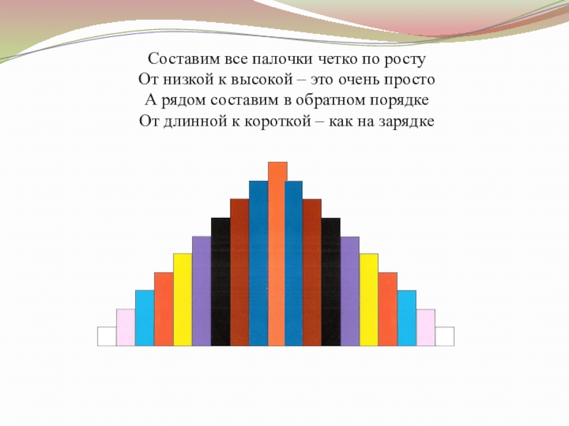 28. "Найди в наборе самую длинную и самую короткую палочку. Поставь их друг на друга; а теперь рядом друг с другом".