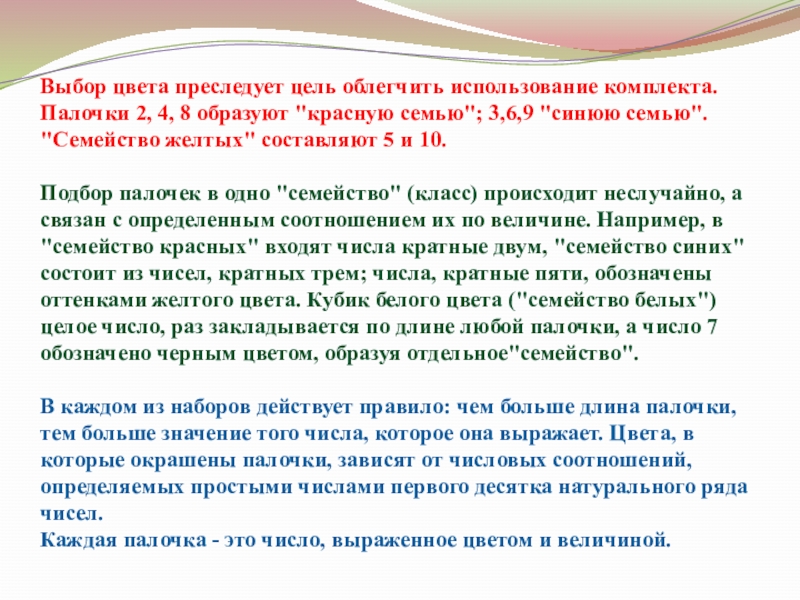 Подбор палочек в одно "семейство" (класс) происходит неслучайно, а связан с определенным соотношением их по величине. Например, в "семейство красных" входят числа кратные двум, "семейство синих" состоит из чисел, кратных трем; числа, кратные пяти, обозначены оттенками желтого цвета. Кубик белого цвета ("семейство белых") целое число, раз закладывается по длине любой палочки, а число 7 обозначено черным цветом, образуя отдельное"семейство".
