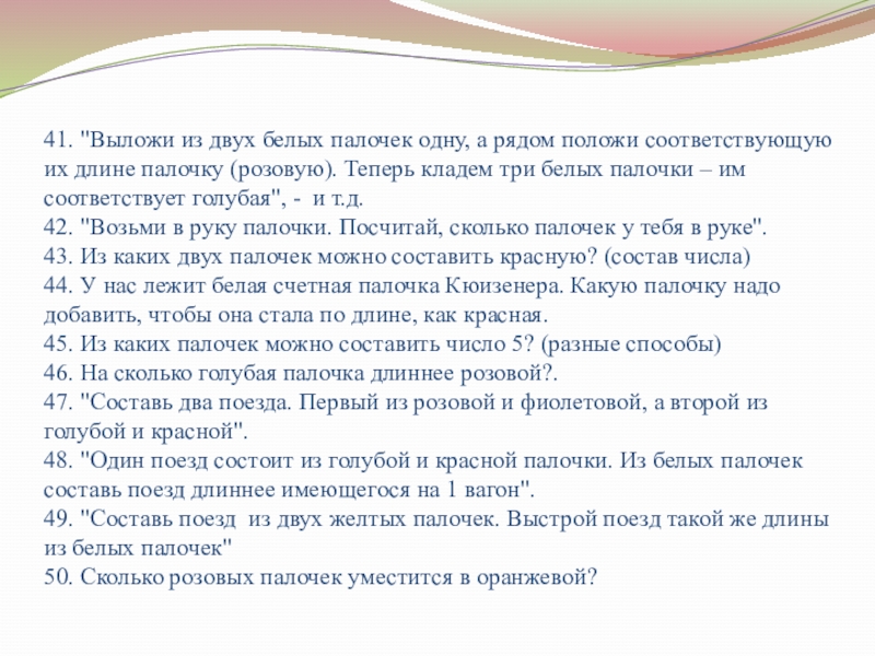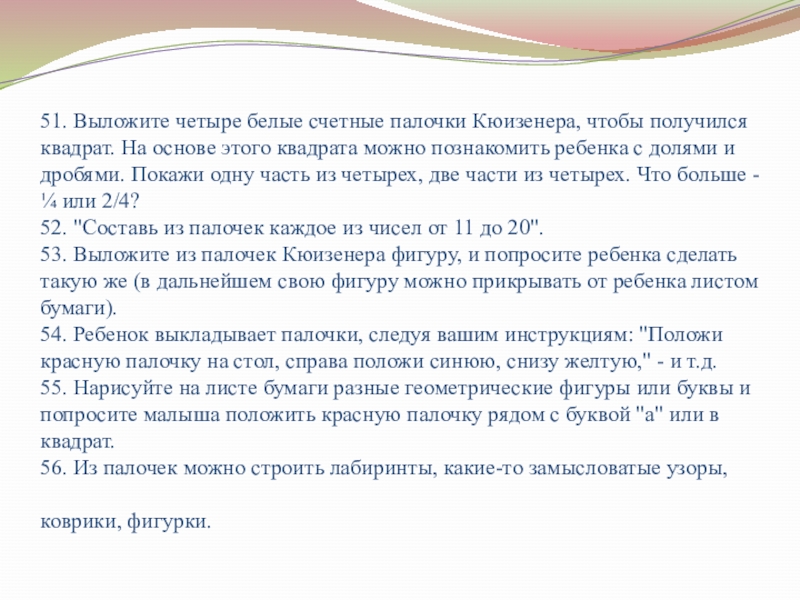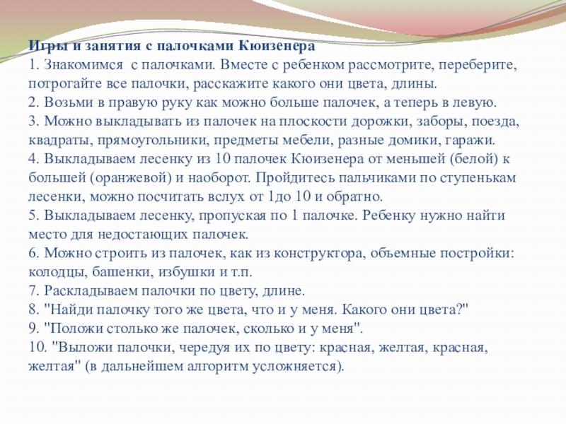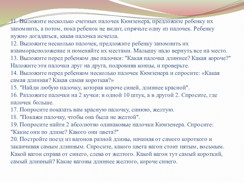 Слайд 1811. Выложите несколько счетных палочек Кюизенера, предложите ребенку их запомнить, а