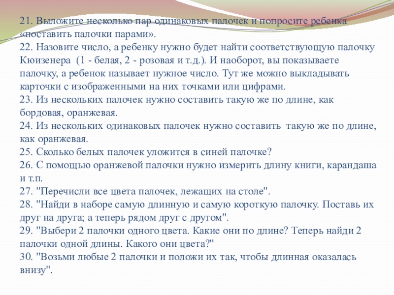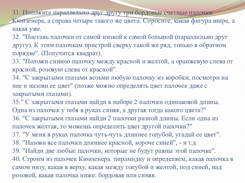 29. "Выбери 2 палочки одного цвета. Какие они по длине? Теперь найди 2 палочки одной длины. Какого они цвета?"