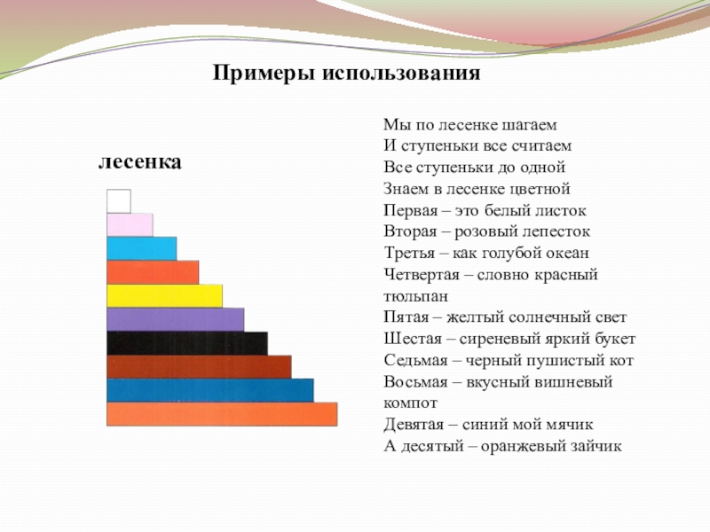 4. Выкладываем лесенку из 10 палочек Кюизенера от меньшей (белой) к большей (оранжевой) и наоборот. Пройдитесь пальчиками по ступенькам лесенки, можно посчитать вслух от 1до 10 и обратно.
