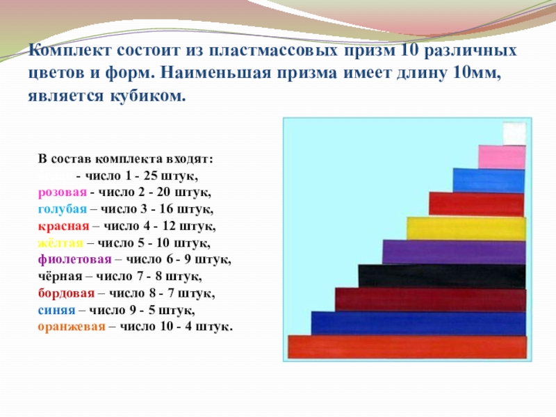 Слайд 3Комплект состоит из пластмассовых призм 10 различных цветов и форм. Наименьшая