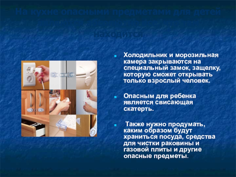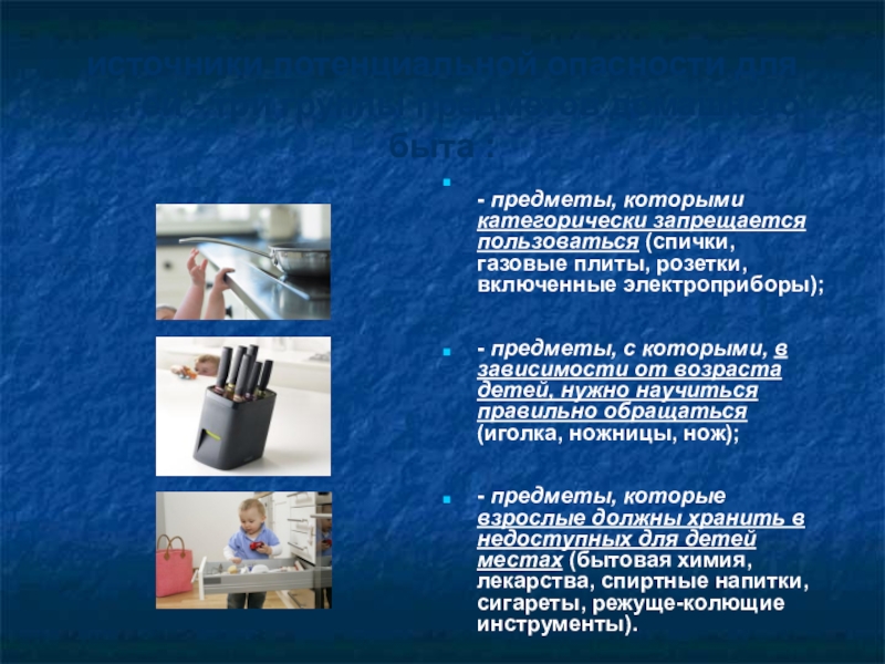 - предметы, которые взрослые должны хранить в недоступных для детей местах (бытовая химия, лекарства, спиртные напитки, сигареты, режуще-колющие инструменты).