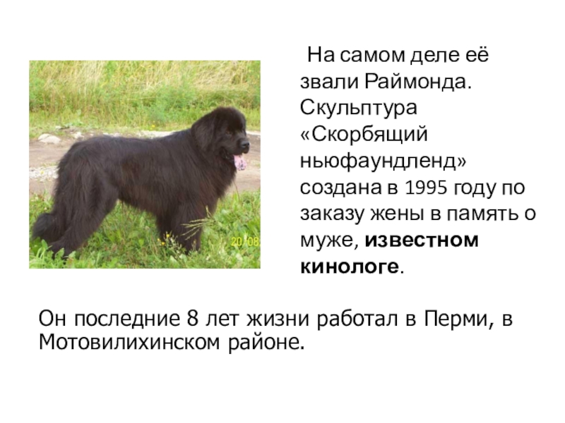 Слайд 13 На самом деле её звали Раймонда. Скульптура «Скорбящий ньюфаундленд» создана в