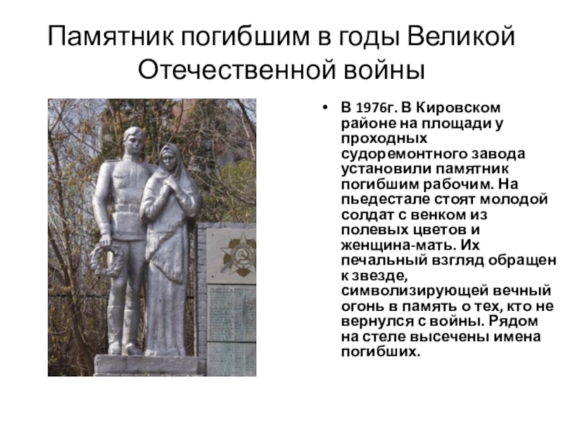 Слайд 22Памятник погибшим в годы Великой Отечественной войны