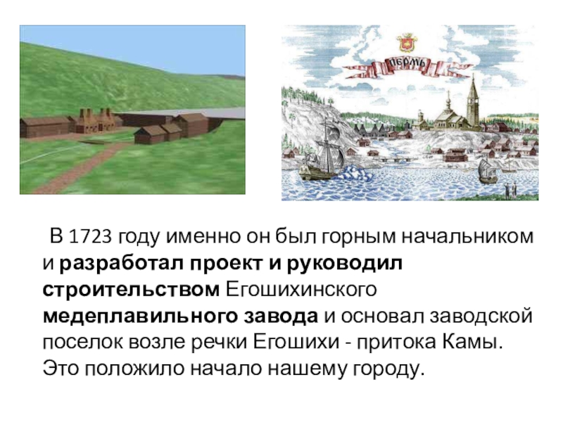 и руководил строительством Егошихинского медеплавильного завода и основал заводской поселок возле речки Егошихи - притока Камы. Это положило начало нашему городу.