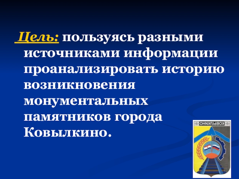 Цель: пользуясь разными источниками информации проанализировать историю возникновения монументальных памятников города Ковылкино.