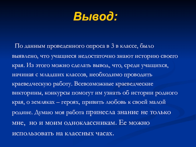 Вывод:  По данным проведенного опроса в 3 в классе, быловыявлено, что учащиеся недостаточно знают историю своегокрая.