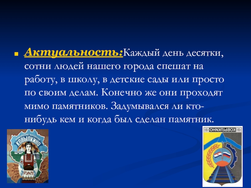 Актуальность:Каждый день десятки, сотни людей нашего города спешат на работу, в школу, в детские сады или просто по своим делам. Конечно же они проходят мимо памятников. Задумывался ли кто- нибудь кем и когда был сделан памятник.