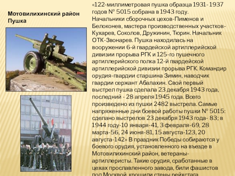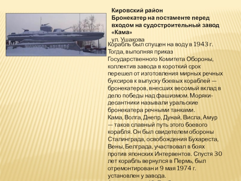 Кама, Волга, Днепр, Дунай, Висла, Амур — таков славный путь этого боевого корабля. Он был свидетелем обороны Сталинграда, освобождения Бухареста, Вены, Белграда, участвовал в боях против японских Интервентов. Спустя 30 лет корабль вернулся в Пермь, был отремонтирован и 9 мая 1974 г. установлен у завода.