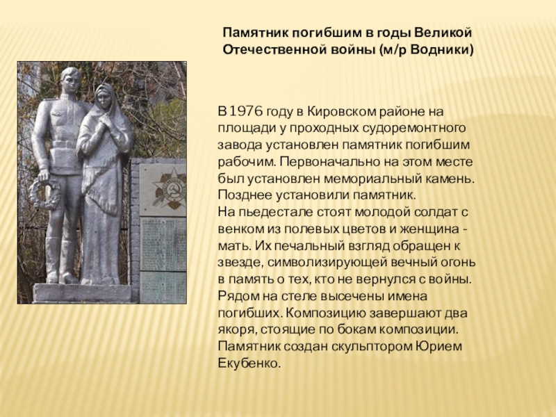 На стене монумента - слова: «Им жизнью обязана наша страна. Запомни, товарищ, их имена». Ниже высечены имена рабочих и служащих завода.