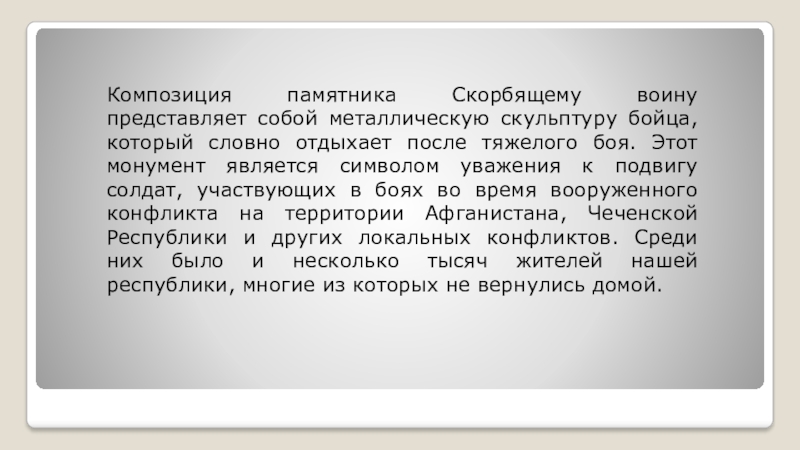 отдыхает после тяжелого боя. Этот монумент является символом уважения к подвигу солдат, участвующих в боях во время вооруженного конфликта на территории Афганистана, Чеченской Республики и других локальных конфликтов. Среди них было и несколько тысяч жителей нашей республики, многие из которых не вернулись домой.