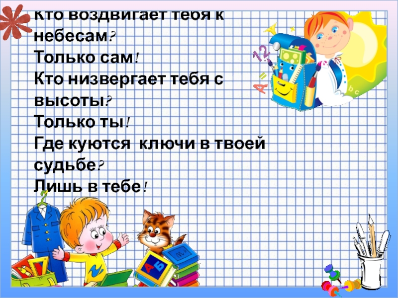 Слайд 21Кто воздвигает тебя к небесам? Только сам! Кто низвергает тебя с высоты? Только