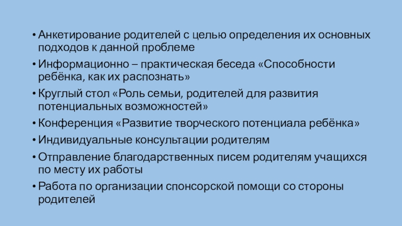 - совместно с родителями поддерживать талантливого ребёнка в реализации его интересов в школе и семье