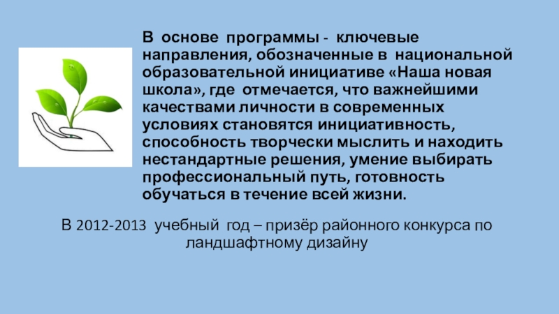 В 2012-2013 учебный год – призёр районного конкурса по ландшафтному дизайну