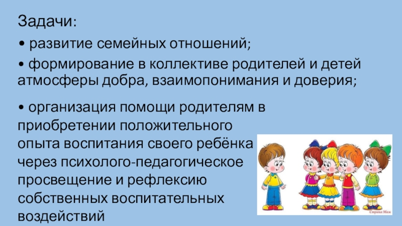• организация помощи родителям в приобретении положительного опыта воспитания своего ребёнка через психолого-педагогическое просвещение и рефлексию собственных воспитательных воздействий