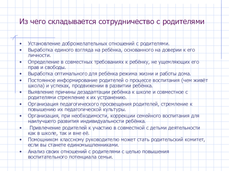 Из чего складывается сотрудничество с родителямиУстановление доброжелательных отношений с родителями. Выработка единого взгляда на ребёнка, основанного на