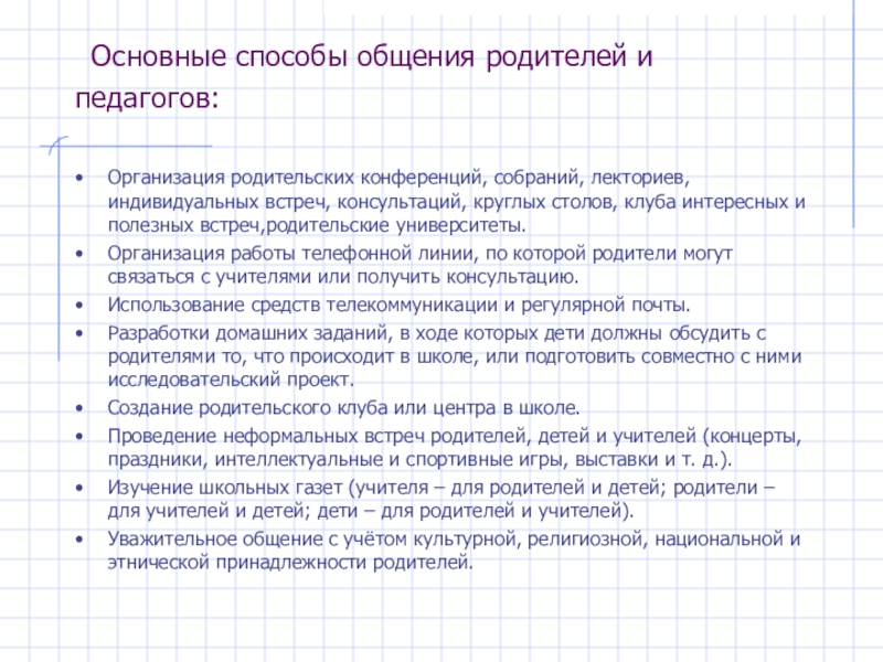 Основные способы общения родителей и педагогов:Организация родительских конференций, собраний, лекториев, индивидуальных встреч, консультаций, круглых столов, клуба