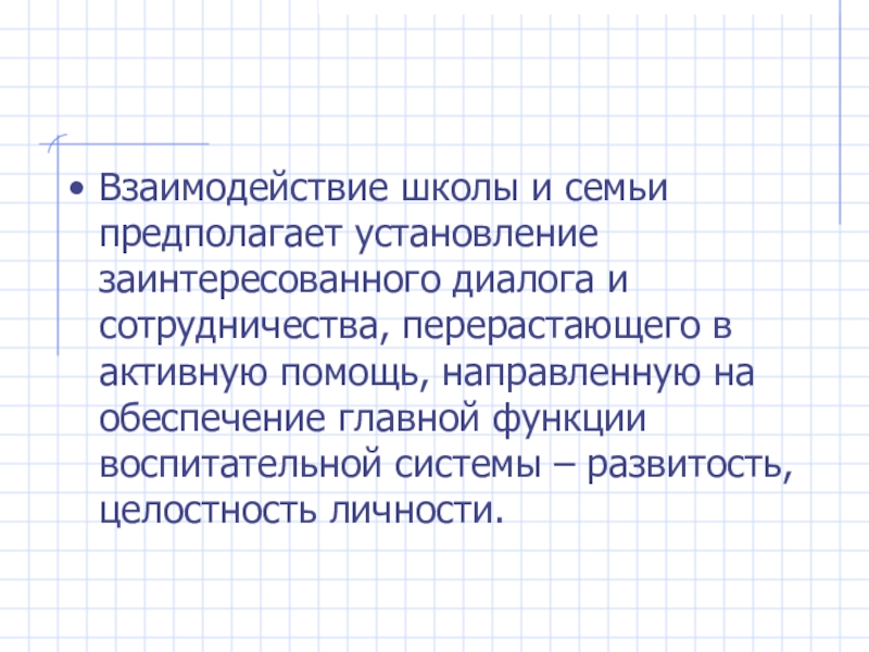 Взаимодействие школы и семьи предполагает установление заинтересованного диалога и сотрудничества, перерастающего в активную помощь, направленную на обеспечение главной функции воспитательной системы – развитость, целостность личности.