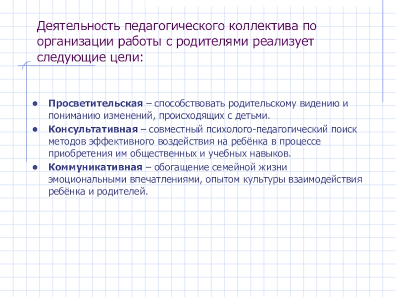 Деятельность педагогического коллектива по организации работы с родителями реализует следующие цели:Просветительская – способствовать родительскому видению и пониманию