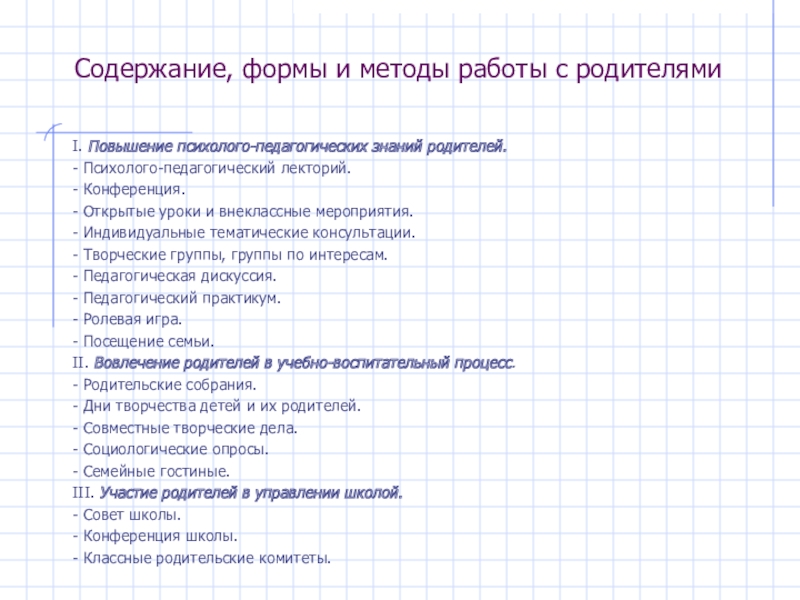 Содержание, формы и методы работы с родителями I. Повышение психолого-педагогических знаний родителей. - Психолого-педагогический лекторий. - Конференция.