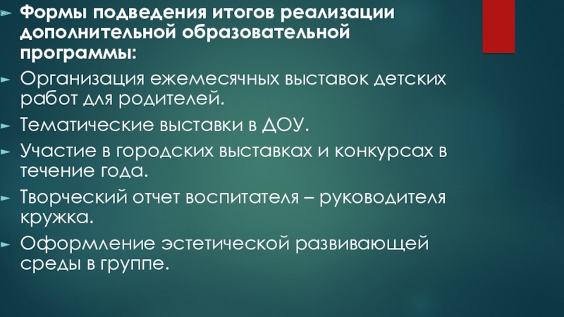 Слайд 8Формы подведения итогов реализации дополнительной образовательной программы: