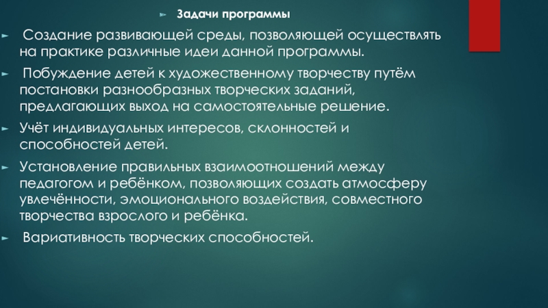 Задачи программы Создание развивающей среды, позволяющей осуществлять на практике различные идеи данной программы. Побуждение детей к художественному