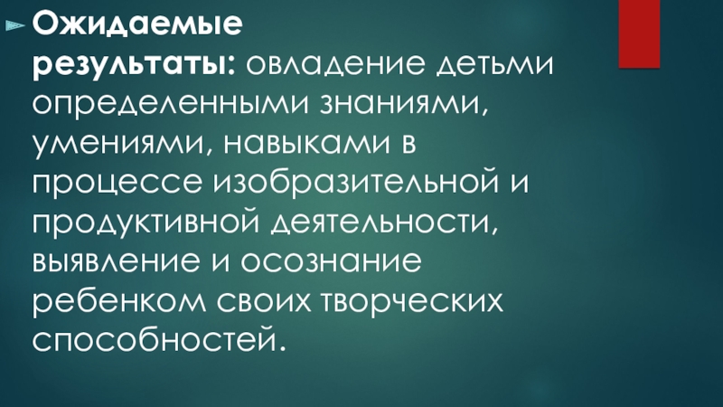 Слайд 6Ожидаемые результаты: овладение детьми определенными знаниями, умениями, навыками в процессе изобразительной и