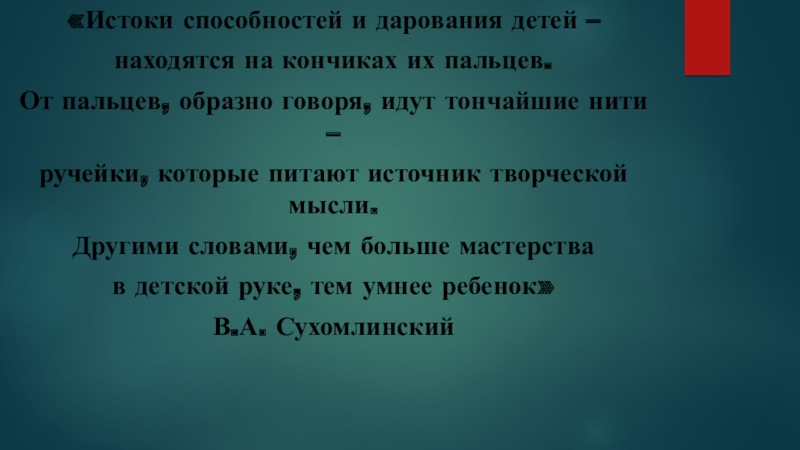 «Истоки способностей и дарования детей –находятся на кончиках их пальцев.От пальцев, образно говоря, идут тончайшие нити –ручейки, которые питают источник творческой мысли.Другими словами, чем больше мастерствав детской руке, тем умнее ребенок»В.А. Сухомлинский