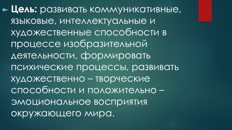 Слайд 3Цель: развивать коммуникативные, языковые, интеллектуальные и художественные способности в процессе изобразительной деятельности,
