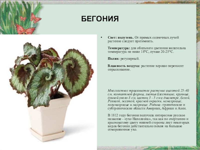 В 1812 году бегония получила интересное русское название - «ухо Наполеона», так как по очертанию и красноватому цвету нижней стороны лист некоторых видов бегонии действительно похож на большое отмороженное ухо.