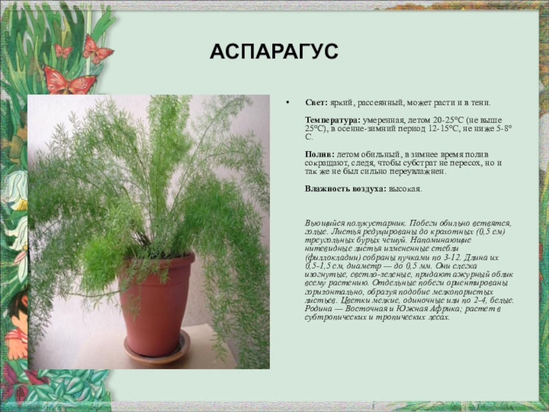 Вьющийся полукустарник. Побеги обильно ветвятся, голые. Листья редуцированы до крохотных (0,5 см) треугольных бурых чешуй. Напоминающие нитевидные листья измененные стебли (филлокладии) собраны пучками по 3-12. Длина их 0,5-1,5 см, диаметр — до 0,5 мм. Они слегка изогнутые, светло-зеленые, придают ажурный облик всему растению. Отдельные побеги ориентированы горизонтально, образуя подобие мелкопористых листьев. Цветки мелкие, одиночные или по 2-4, белые. Родина — Восточная и Южная Африка; растет в субтропических и тропических лесах.