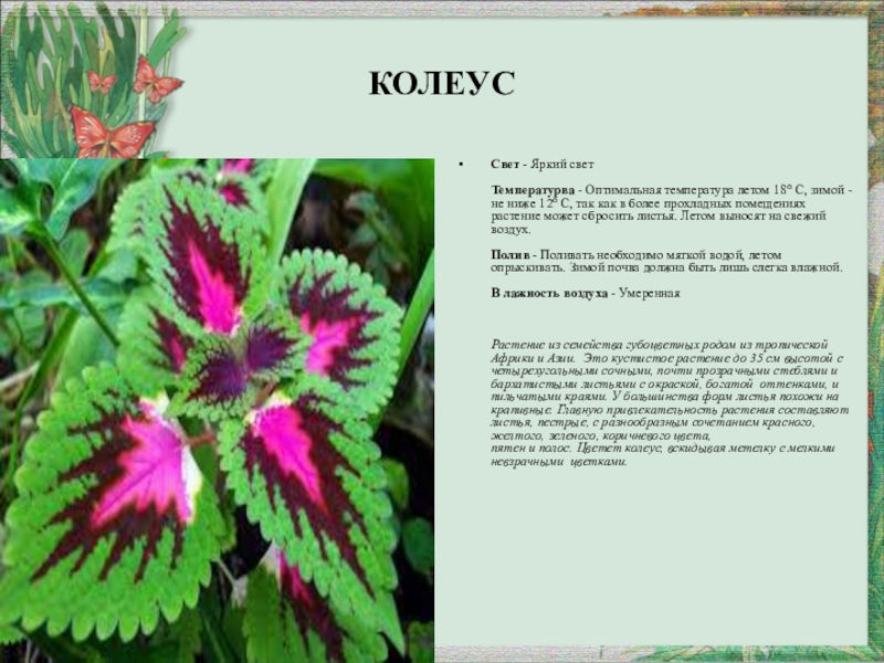 Растение из семейства губоцветных родом из тропической Африки и Азии. Это кустистое растение до 35 см высотой с четырехугольными сочными, почти прозрачными стеблями и бархатистыми листьями с окраской, богатой оттенками, и пильчатыми краями. У большинства форм листья похожи на крапивные. Главную привлекательность растения составляют листья, пестрые, с разнообразным сочетанием красного, желтого, зеленого, коричневого цвета,