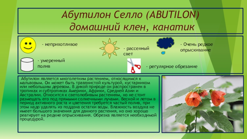 мальвовым. Он может быть травянистой культурой, кустарником или небольшим деревом. В дикой природе он распространен в тропиках и субтропиках Америки, Африки, Средней Азии и Австралии. Относится к светолюбивым растениям, но не стоит размещать его под прямыми солнечными лучами. Весной и летом в период активного роста и цветения требуется частый полив, при этом надо удалять из поддона остатки воды. Влажность воздуха не имеет большого значения для данного растения, но оно хорошо реагирует на редкие опрыскивания. Обрезка является необходимой процедурой.