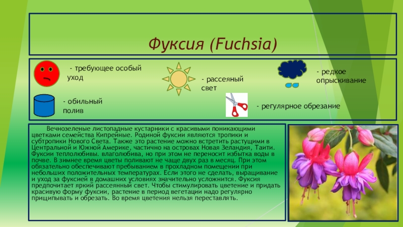 фуксии являются тропики и субтропики Нового Света. Также это растение можно встретить растущими в Центральной и Южной Америке, частично на островах Новая Зеландия, Таити. Фуксии теплолюбивы. влаголюбива, но при этом не переносит избытка воды в почве. В зимнее время цветы поливают не чаще двух раз в месяц. При этом обязательно обеспечивают пребыванием в прохладном помещении при небольших положительных температурах. Если этого не сделать, выращивание и уход за фуксией в домашних условиях значительно усложнится. Фуксия предпочитает яркий рассеянный свет. Чтобы стимулировать цветение и придать красивую форму фуксии, растение в период вегетации надо регулярно прищипывать и обрезать. Во время цветения нельзя переставлять.