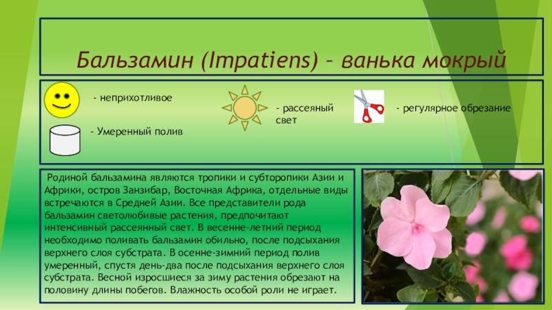 и Африки, остров Занзибар, Восточная Африка, отдельные виды встречаются в Средней Азии. Все представители рода бальзамин светолюбивые растения, предпочитают интенсивный рассеянный свет. В весенне-летний период необходимо поливать бальзамин обильно, после подсыхания верхнего слоя субстрата. В осенне-зимний период полив умеренный, спустя день-два после подсыхания верхнего слоя субстрата. Весной изросшиеся за зиму растения обрезают на половину длины побегов. Влажность особой роли не играет.
