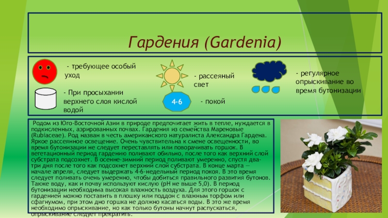 нуждается в подкисленных, аэрированных почвах. Гардения из семейства Мареновые (Rubiaceae). Род назван в честь американского натуралиста Александра Гардена. Яркое рассеянное освещение. Очень чувствительна к смене освещенности, во время бутонизации не следует переставлять или поворачивать горшок. В вегетационный период гардению поливают обильно, после того как верхний слой субстрата подсохнет. В осенне-зимний период поливают умеренно, спустя два-три дня после того как подсохнет верхний слой субстрата. В конце марта — начале апреля, следует выдержать 4-6-недельный период покоя. В это время следует поливать очень умеренно, чтобы добиться правильного развития бутонов. Также воду, как и почву используют кислую (pH не выше 5,0). В период бутонизации необходима высокая влажность воздуха. Для этого горшок с гарденией можно поставить в плошку или поддон с влажным торфом или сфагнумом, при этом дно горшка не должно касаться воды. В это же время необходимо опрыскивание, но как только бутоны начнут распускаться, опрыскивание следует прекратить.