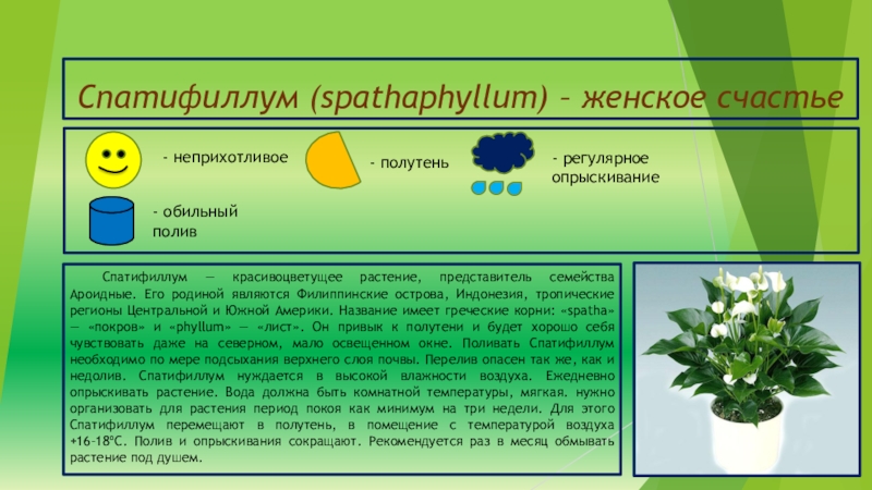 Слайд 8Спатифиллум (spathaphyllum) – женское счастье