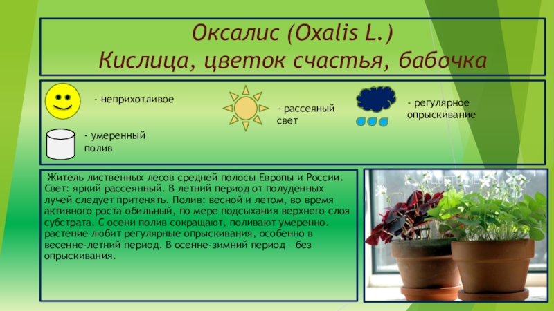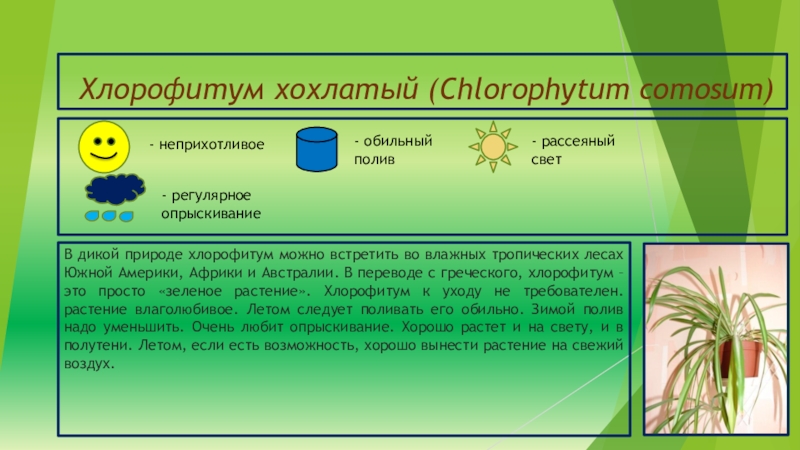 влажных тропических лесах Южной Америки, Африки и Австралии. В переводе с греческого, хлорофитум – это просто «зеленое растение». Хлорофитум к уходу не требователен. растение влаголюбивое. Летом следует поливать его обильно. Зимой полив надо уменьшить. Очень любит опрыскивание. Хорошо растет и на свету, и в полутени. Летом, если есть возможность, хорошо вынести растение на свежий воздух.