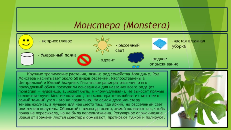 Крупные тропические растения, лианы; род семейства Ароидные. Род Монстера насчитывает