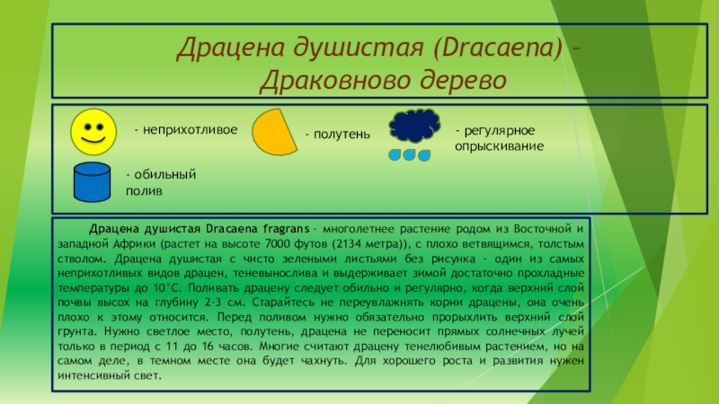 растение родом из Восточной и западной Африки (растет на высоте 7000 футов (2134 метра)), с плохо ветвящимся, толстым стволом. Драцена душистая с чисто зелеными листьями без рисунка - один из самых неприхотливых видов драцен, теневынослива и выдерживает зимой достаточно прохладные температуры до 10°С. Поливать драцену следует обильно и регулярно, когда верхний слой почвы высох на глубину 2-3 см. Старайтесь не переувлажнять корни драцены, она очень плохо к этому относится. Перед поливом нужно обязательно прорыхлить верхний слой грунта. Нужно светлое место, полутень, драцена не переносит прямых солнечных лучей только в период с 11 до 16 часов. Многие считают драцену тенелюбивым растением, но на самом деле, в темном месте она будет чахнуть. Для хорошего роста и развития нужен интенсивный свет.