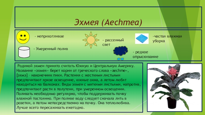 «эхмея» берет корни от греческого слова «aechme», [эхмэ] – наконечник пики. Растения с жесткими листьями предпочитают яркое освещение, южные окна, а летом любят находиться на балконах. Виды эхмеи с мягкими листьями, напротив, предпочитают расти в полутени, при умеренном освещении. Поливать необходимо регулярно, чтобы поддерживать почву влажной постоянно. При поливе воду следует сначала лить в розетки, а потом непосредственно на почву. Она теплолюбива. Лучше всего пересаживать ежегодно.