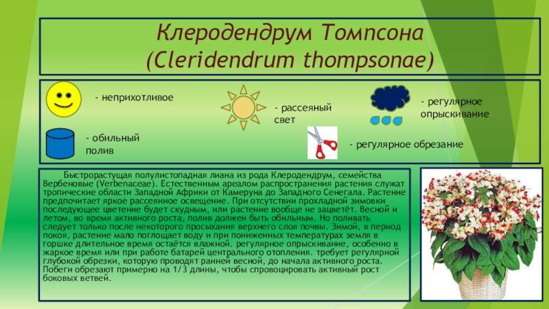 (Verbenaceae). Естественным ареалом распространения растения служат тропические области Западной Африки от Камеруна до Западного Сенегала. Растение предпочитает яркое рассеянное освещение. При отсутствии прохладной зимовки последующее цветение будет скудным, или растение вообще не зацветёт. Весной и летом, во время активного роста, полив должен быть обильным. Но поливать следует только после некоторого просыхания верхнего слоя почвы. Зимой, в период покоя, растение мало поглощает воду и при пониженных температурах земля в горшке длительное время остаётся влажной. регулярное опрыскивание, особенно в жаркое время или при работе батарей центрального отопления. требует регулярной глубокой обрезки, которую проводят ранней весной, до начала активного роста. Побеги обрезают примерно на 1/3 длины, чтобы спровоцировать активный рост боковых ветвей.