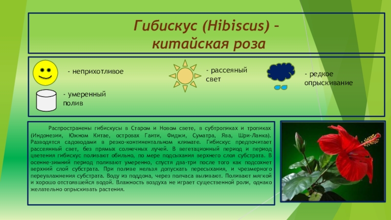 свете, в субтропиках и тропиках (Индонезии, Южном Китае, островах Гаити, Фиджи, Суматра, Ява, Шри-Ланка). Разводятся садоводами в резко-континентальном климате. Гибискус предпочитает рассеянный свет, без прямых солнечных лучей. В вегетационный период и период цветения гибискус поливают обильно, по мере подсыхания верхнего слоя субстрата. В осенне-зимний период поливают умеренно, спустя два-три после того как подсохнет верхний слой субстрата. При поливе нельзя допускать пересыхания, и чрезмерного переувлажнения субстрата. Воду из поддона, через полчаса выливают. Поливают мягкой и хорошо отстоявшейся водой. Влажность воздуха не играет существенной роли, однако желательно опрыскивать растения.