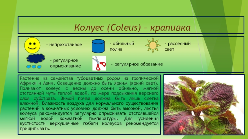 Африки и Азии. Освещение должно быть ярким (яркий свет). Поливают колеус с весны до осени обильно, мягкой отстоянной чуть теплой водой, по мере подсыхания верхнего слоя субстрата. Зимой почва должна быть лишь слегка влажной. Влажность воздуха для нормального существования растений в комнатных условиях должна быть высокой, листья колеуса рекомендуется регулярно опрыскивать отстоявшейся мягкой водой комнатной температуры. Для усиления кустистости верхушечные побеги колеусов рекомендуется прищипывать.