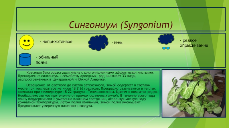 Красивая быстрорастущая лиана с многочисленными эффектными листьями. Принадлежит сингониум к