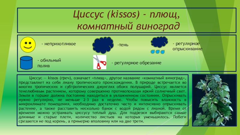 «плющ», другое название «комнатный виноград», представляет из себя лиану тропического происхождения. В природе встречается во многих тропических и субтропических джунглях обоих полушарий. Циссус является тенелюбивым растением, которому совершенно противопоказан яркий солнечный свет. Земля в горшке должна постоянно находиться в увлажненном состоянии. Опрыскивать нужно регулярно, не меньше 2-3 раз в неделю. Чтобы повысить влажность в микроклимате помещения, необходимо достаточно часто и интенсивно опрыскивать растение, а также расставить несколько банок с водой рядом с лианой. Время от времени можно устраивать циссусу теплый душ. Для подрезки выбираются самые длинные и старые плети, количество листьев на которых уменьшилось. Побеги срезаются не под корень, а примерно вполовину или на две трети.