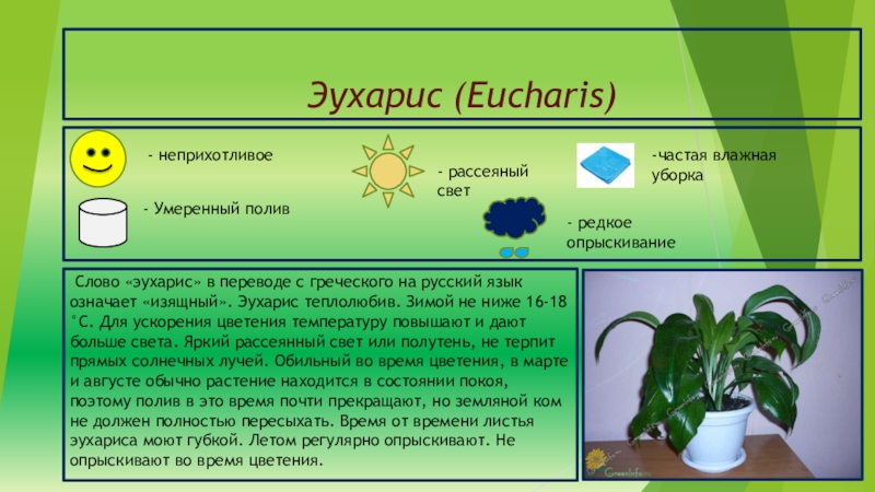 означает «изящный». Эухарис теплолюбив. Зимой не ниже 16-18 °С. Для ускорения цветения температуру повышают и дают больше света. Яркий рассеянный свет или полутень, не терпит прямых солнечных лучей. Обильный во время цветения, в марте и августе обычно растение находится в состоянии покоя, поэтому полив в это время почти прекращают, но земляной ком не должен полностью пересыхать. Время от времени листья эухариса моют губкой. Летом регулярно опрыскивают. Не опрыскивают во время цветения.